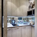 - A panelled wall conceals a small kitchen and powder room