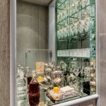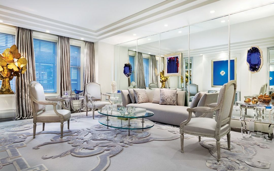- The suite’s private quarters continue the monochromatic, silvery grey palette and the cosmopolitan narrative established in the drawing room with a Louis-style bed flanked by acrylic consoles.