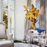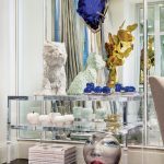 - Objects and artworks include: ‘Oiseau Bleu’ sculpture by François-Xavier Lalanne; a puppy vase and small blue ‘Balloon Dog’ sculpture by Jeff Koons; a bronze monkey by Giulia Mangani on the Poillerat-inspired console; one of Manolo Valdes’s ‘Mariposa’ sculptures depicting the head of a woman engulfed in a kaleidoscope of fluttering butterflies; and a ceramic egg by Fabergé.