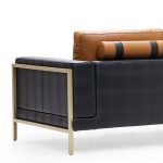 CLARK – An elegant brushed champagne coloured metal framework hosts the new three seat CLARK sofa by Tonino Lamborghini Casa. It is elegant and impactful at the same time, it has a basis with armrests and back which are covered with dark leather with “Bricks” printed on it; the inside cushions are made of feather and covered with whisky colour leather for a visual appealing and very glamour contrast. CLARK is offered supplied with comfortable and elegant headrest rollers.