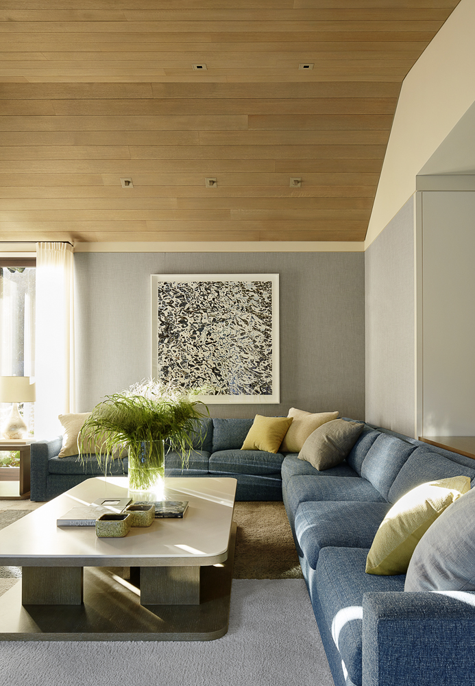 Simple sculptural shapes, textural woven fabrics, organic elements and a few accents of forest colours complete the marriage of inside and out. ‘Almost every piece of furniture has an angle or slope,’ notes David Oldroyd of ODADA. ‘But more natural shapes – such as the curvy chair legs or pebble-shaped poufs – bring in some softness,’ he adds, ‘the palette is inspired by what you see through the windows.’ David Oldroyd’s design philosophy is built on the modern re-statement of classical principles to create beautiful interiors that have an emotional impact on their occupants.