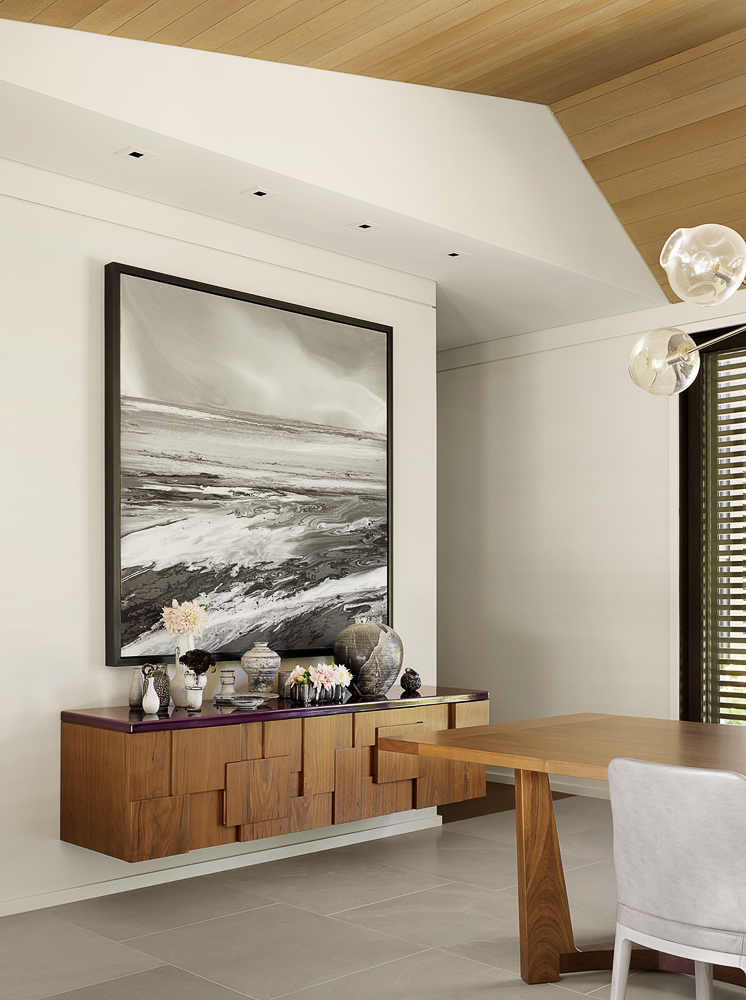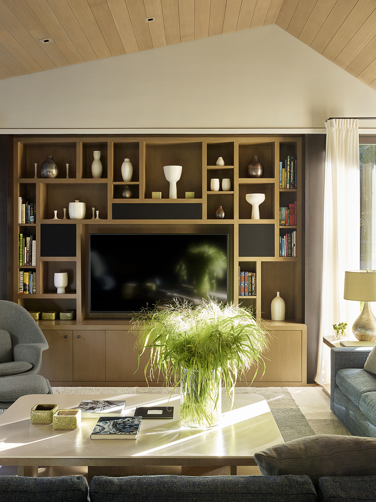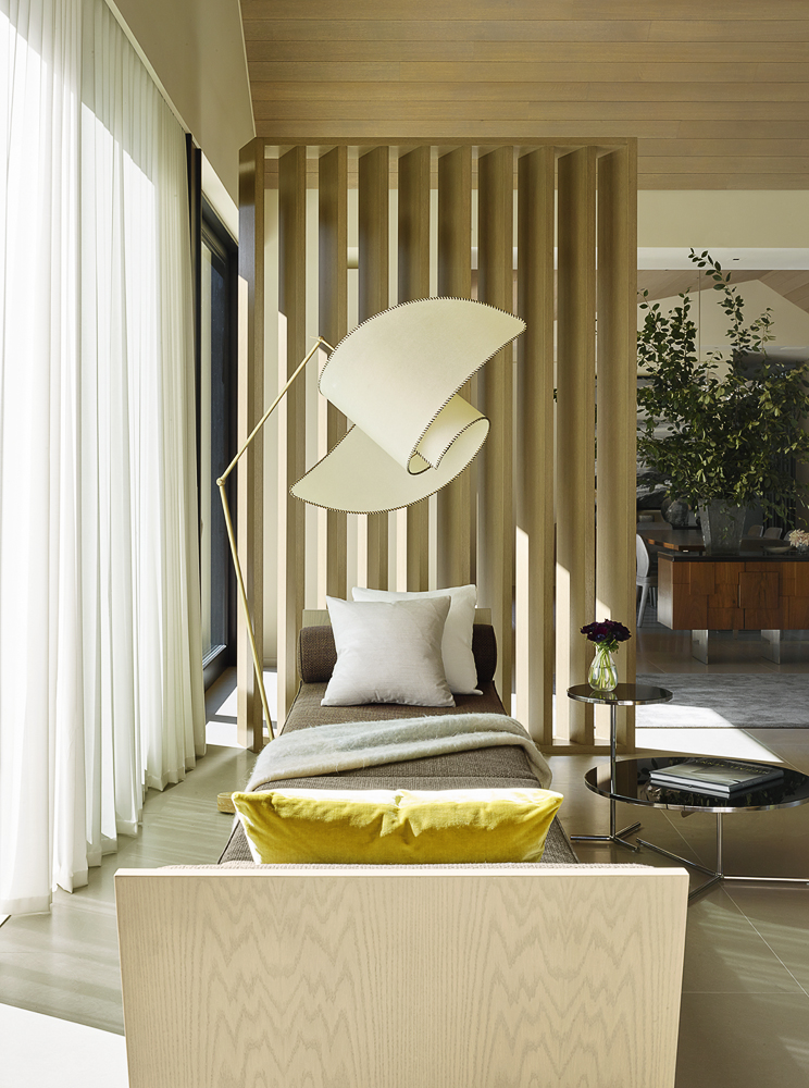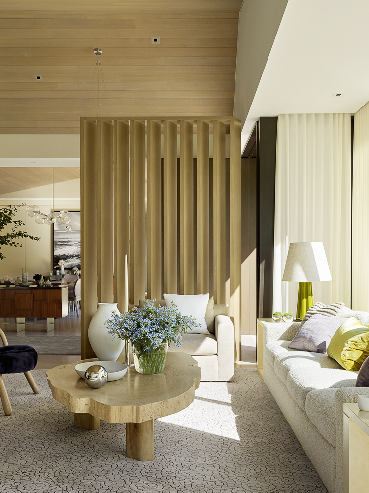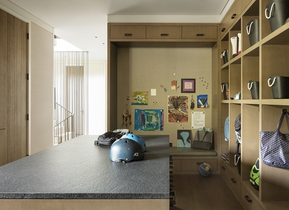 Inside, the team created zones where family activities can happen in a communal way. ‘The home was organized into public and private zones,’ notes Mike McCabe of Walker Warner Architects, ‘with the family’s everyday living spaces easing into one another. The architectural intent was to provide a house that lives small day to day for the family but can expand to accommodate bigger gatherings and events.’ A mudroom with cubbies allows for easy organisation of family belongings while everyday casual areas for living, dining and cooking are immediately adjacent to the pool and terrace. ‘The private parts of the house are about retreat and family time,’ adds McCabe, ‘while the public parts allow them to mingle with their guests and enjoy all the site has to offer.’