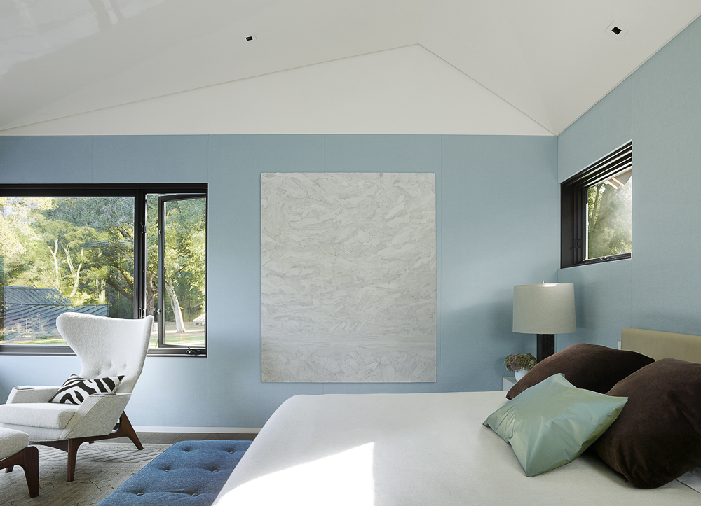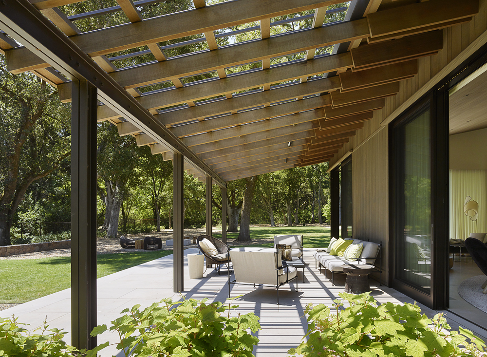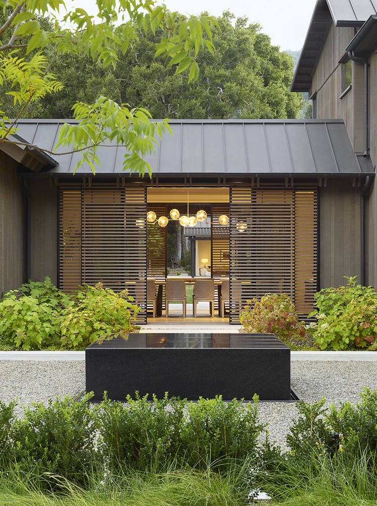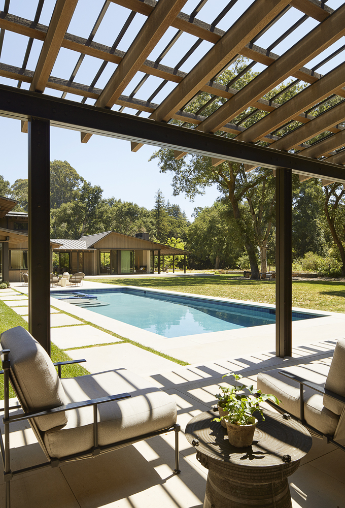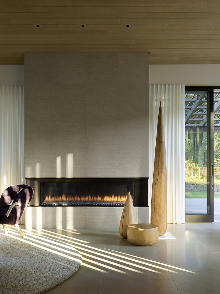 The home’s transparency and relationship to the land reflects the site’s expansiveness, which is evident upon arrival at the formal entry where guests can immediately experience the natural setting through seamless indoor-outdoor connections. Rooflines are stretched to protect the interiors from hot summers, while responding to forms prominent in the California rural landscape which served as design inspiration for the home.