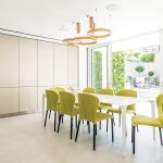 The lower ground floor houses another large-scale open area, containing the kitchen, family dining area, playroom and study space. The heart of the home is a clean and modern Boffi kitchen, with a central island for cooking and seating. The dining area features a Link dining table by Jakob Wagner for B&B Italia, with eight B&B Italia Papillo dining chairs around it, upholstered in a lemon pelle fabric. Along the opposite side of the open kitchen and dining space is a study and play area. Opposite is an open family playroom, whilst off the main open area is an all-white, glazed tiled guest toilet. The lower ground floor also includes a guest bedroom with en suite bathroom.