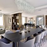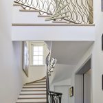 On entry, the language of the scheme is immediately apparent. The new double-volume stairwell within the formal entrance area allows for plenty of light and air. An elegant monochrome palette features crisp white walls and black-lacquered Lenox octagonal mirrors. The double volume space also features a cascading and sculptural Rhythm light by Vibia, whilst a reimagined staircase is of curved metal design with timber treads and bespoke, carved timber balustrade.