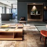 They add: ‘Our design concept was to interpret and domesticate the urban material, such as bare concrete, raw steel and grey granite. The solution was a fusion of urban elements with natural materials: interior wood panels and several shades of natural stone, in order to create a warm and welcoming domestic harmony.