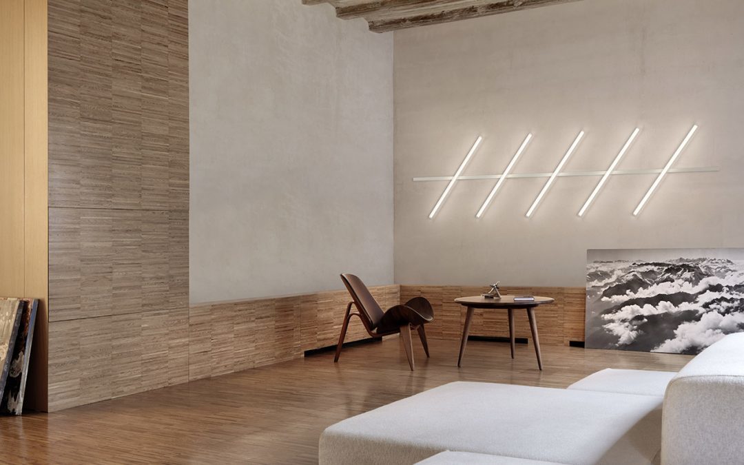 Martín Azúa fuses material with light in his unique design of Halo Wall for VIBIA. In this 2020 evolution of an applique, Halo Wall provides a series of minimalist light sculptures that create a suggestive ambient lighting, which floats over the wall surface while at the same time bathing it with light. The basic unit of Halo Wall is a light rod that measures a metre in length and with its slim-line linearity, different graphic compositions are outlined and can be customised. The light bars, supported by an aluminium profile, can rotate to form parallel, perpendicular and inclined axes. Their modular nature will allow for large configurations to form light murals.