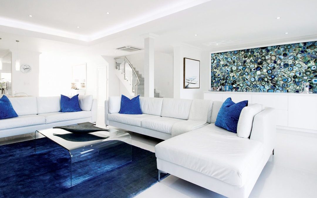 ‘The main task was to keep the use of colour and pattern to a minimum, e.g. white with splashes of ice white, with an emphasis on one focal point: the massive agate sheet, which we used as a backdrop to the Miami-style bar. We designed the access to the lighting, which is behind the agate panel, so that the light source emanating is diffused, creating a pleasant glow rather than a series of overly bright bands of light.’