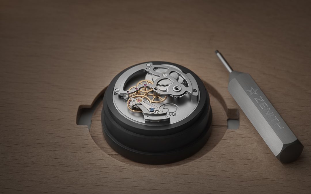 Each issued in a 50-piece limited edition, the three El Primero anniversary watches, as well as the empty cushion designed to accommodate a future 1/1000th of a second chronograph, are presented in a boxed set that also symbolises Zenith’s evolution and future in the field of high frequency. Subtle nuances of grey, leather touches, contemporary woodwork: the presentation box combines watchmaking tradition with innovation in performance and precision. Adorned with the anniversary logo, the satin-brushed grey lid with built-in touch screen opens to reveal a reproduction of a miniature watchmaker’s workbench, complete with a watch mechanism on a rest, adjustable lighting system, magnifying glass and screwdriver. The screw-locked lower part of the box contains a drawer in which the three El Primero chronographs are nestled. In a nod to the past, the box contains an actual die of the chronograph’s coupling-wheel bridge (one of the emblematic components of the El Primero movement). This die is an invitation to purchasers to come and visit the Manufacture in Le Locle and to hand-stamp two coupling-wheel bridges. One will leave with the purchaser in his box, and the other, engraved with his name, will be placed as historical testimony on the entrance wall of the famous attic chosen by Charles Vermot, the Zenith watchmaker who – in the midst of the quartz crisis in the early 1970s – saved the elements essential to the production of the El Primero calibre from destruction by secretly keeping them in that same attic and thus enabled its renaissance in 1984.